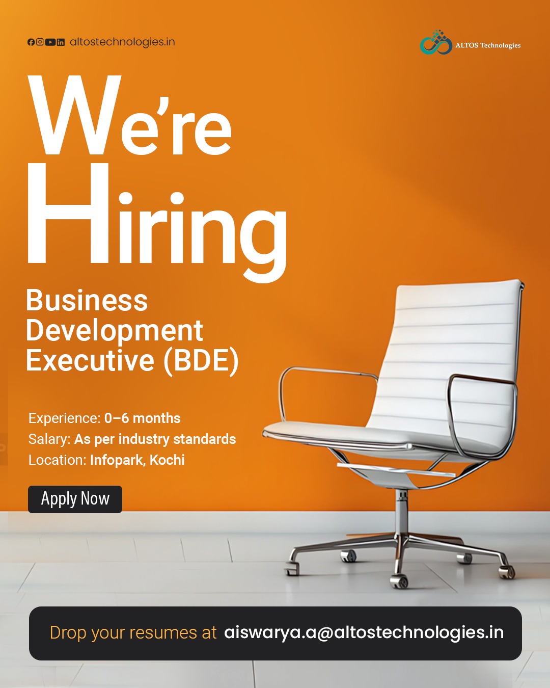 We're looking for a passionate and dynamic Business Development Executive (BDE) to join our team. If you’re energetic, motivated, and eager to start a career in business development, this role is for you! Experience: 0–6 months Salary: As per industry standards Location: Infopark, Kochi Take the next step in your career with a company that values growth, learning, and performance. Join a team where your ideas matter and your contribution creates impact. Click Apply Now or send your resume directly to: aiswarya.a@altostechnologies.in Start your professional journey with ALTOS Technologies!
